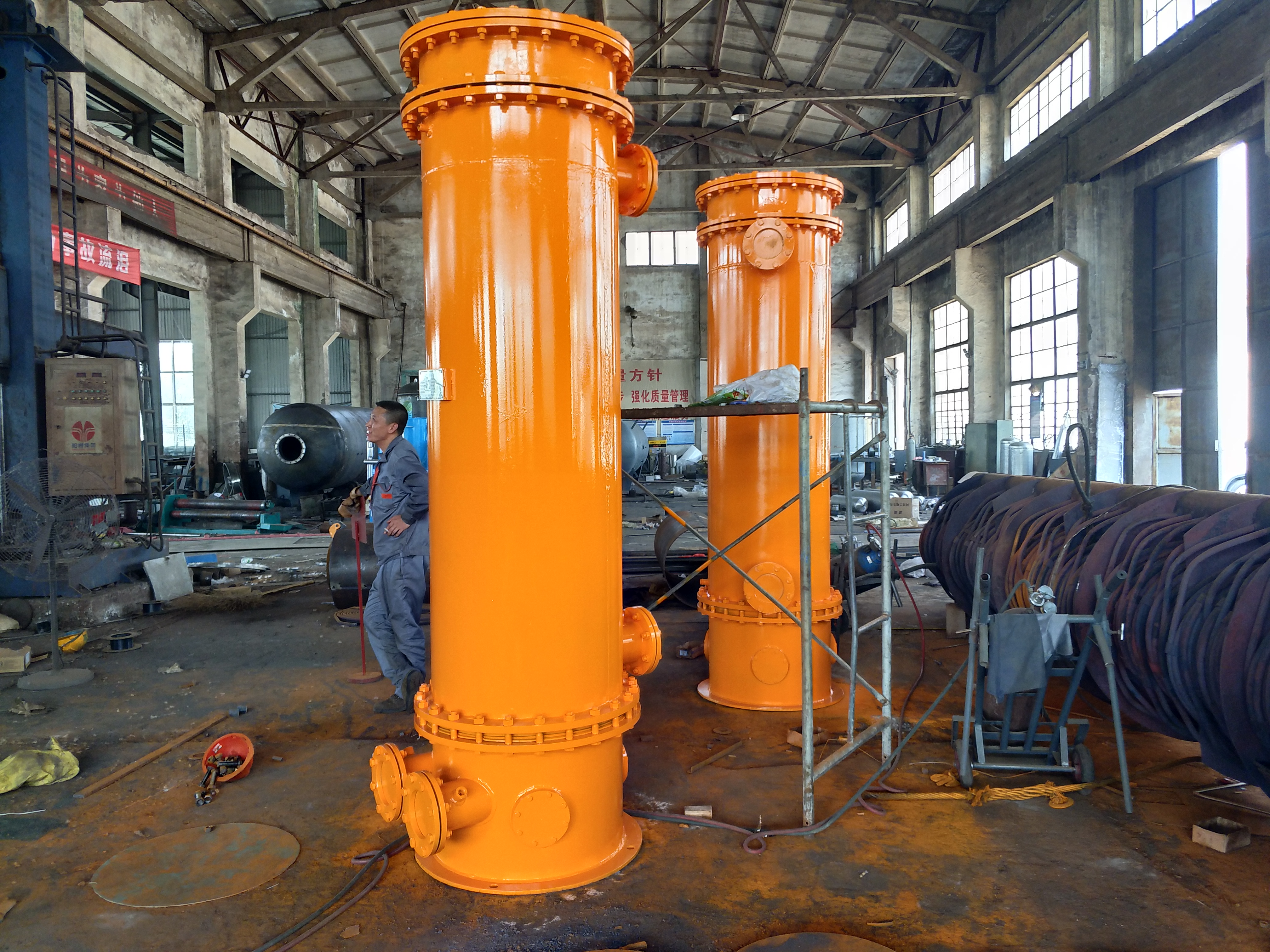 3、列管式冷油器在穿-管、脹口:管板和不銹鋼管都準(zhǔn)備-后,可以穿-不銹鋼管,注意不-用力過-、蹩勁,對(duì)準(zhǔn)自己的孔位裝入,-管兩端外露部分應(yīng)相等,管板孔直徑比管徑略大,約0.5毫米,不遙遙過大或過小。不銹鋼管穿-后可用脹管器脹口,脹管時(shí)力量速度不遙遙過大或過小,脹管長度應(yīng)為管板厚度的2/3,遙遙大于管板的厚度,脹完后兩端用沖子翻邊。